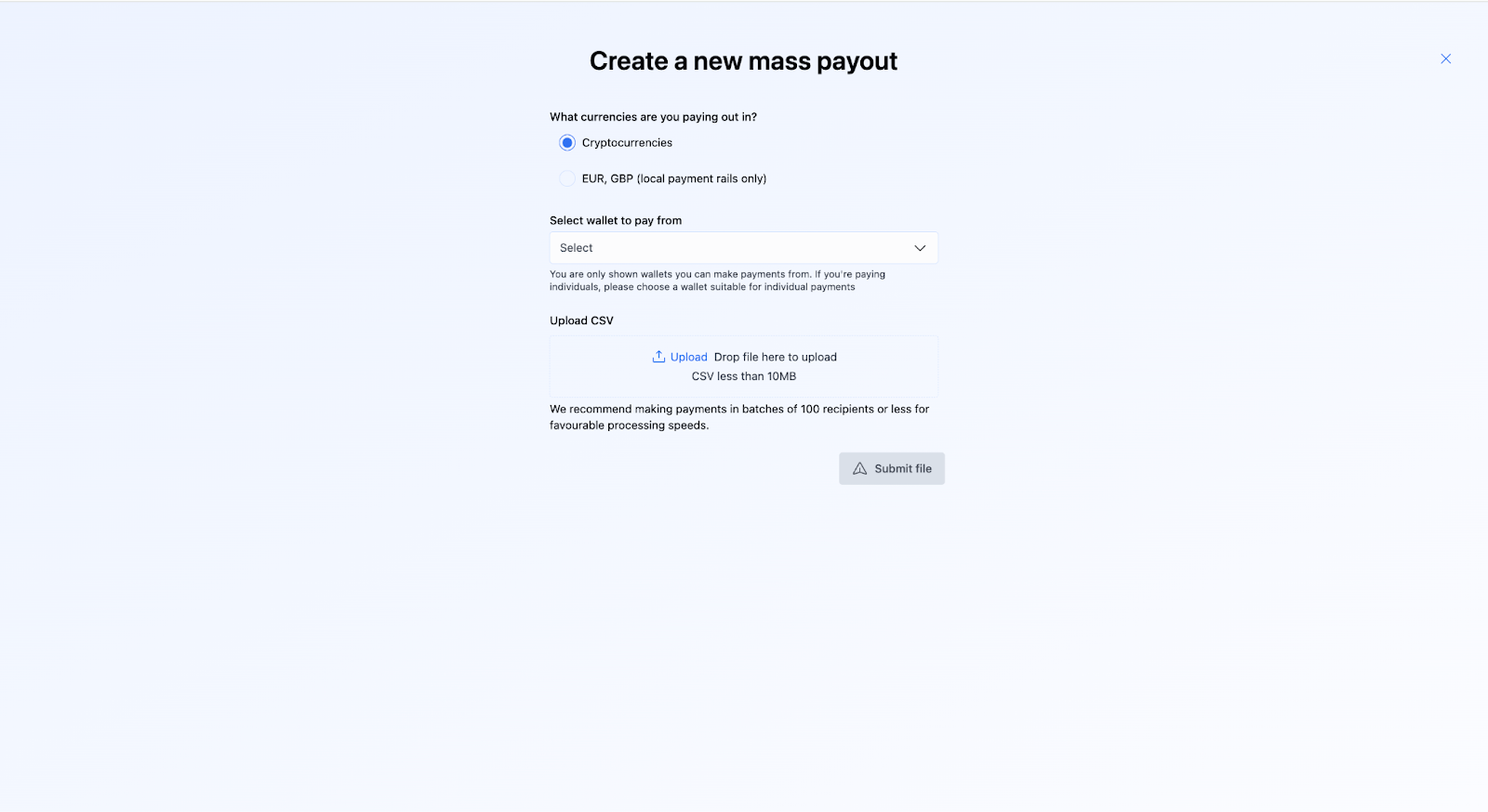 Mass Payouts can be used to pay multiple crypto beneficiaries at once. Mass crypto payouts will allow you to payout from a single fiat wallet (such as USD) to multiple different crypto beneficiaries across different crypto currencies (such as USDC or BTC)