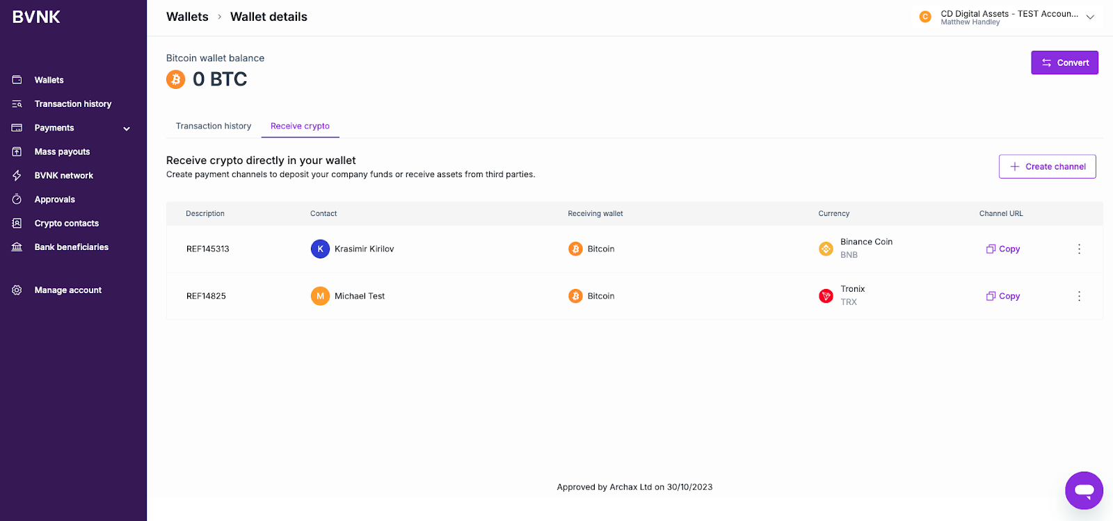 To support the Travel Requirements, please create a Channel and assign a contact to the Channel to continue to be able to receive funds directly into the chosen wallet.