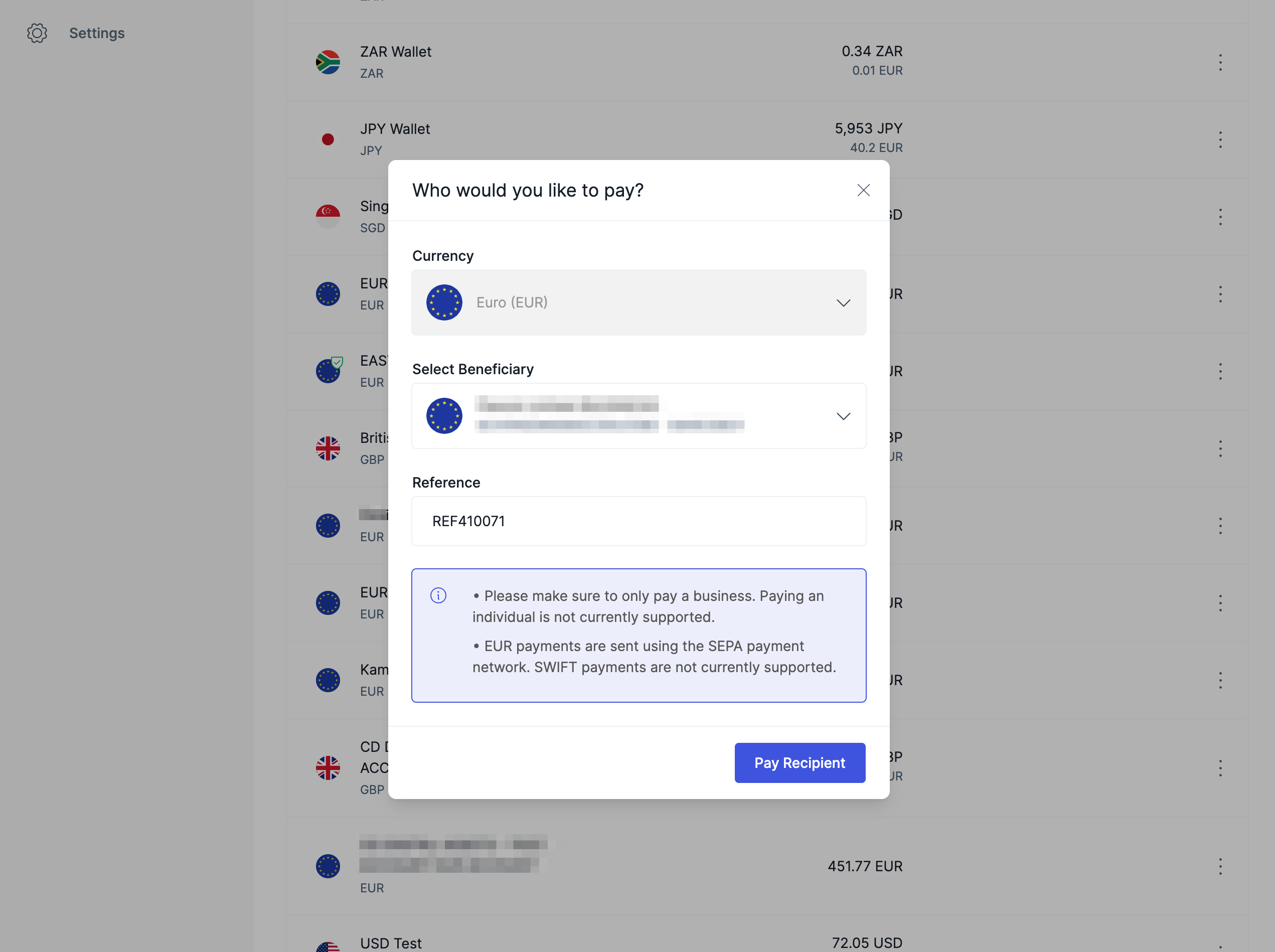 - Select the currency and the beneficiary. If you don't have any beneficiaries yet, add a new beneficiary.