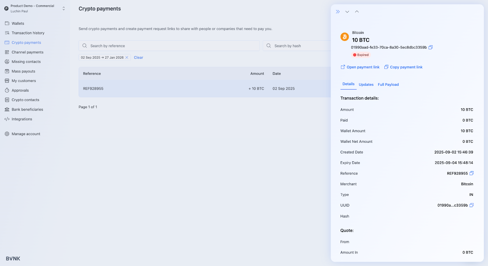 - Navigate to the “Crypto Payments” section on BVNK Portal.