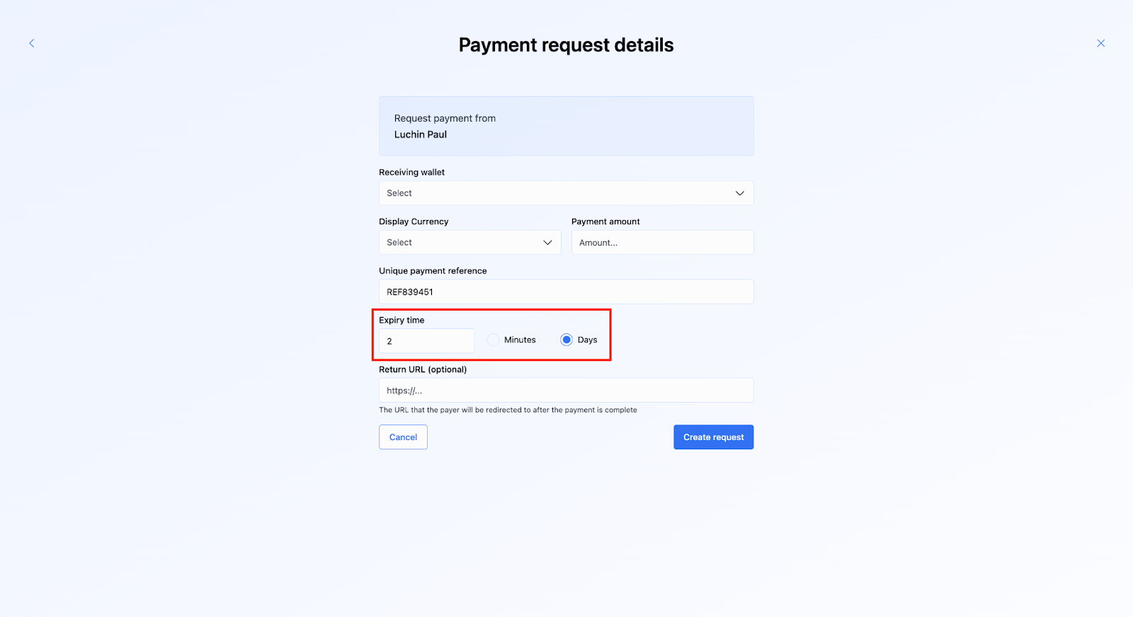 For Crypto payin’s, the expiry date can be set when using the “Request Crypto” functionality in the BVNK Portal. By default, the expiry date is set to 2 days.